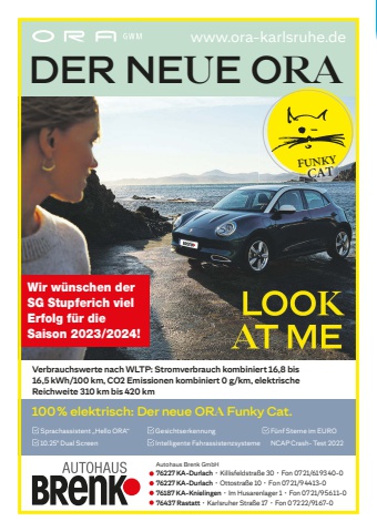 Autohaus Brenk GmbH76227 KA-Durlach %u00b7 Killisfeldstra%u00dfe 30 %u00b7 Fon 07 21/61 93 40-076227 KA-Durlach %u00b7 Ottostra%u00dfe 10 %u00b7 Fon 07 21/9 44 13-076187 KA-Knielingen %u00b7 Im Husarenlager 1 %u00b7 Fon 07 21/9 56 11-076437 Rastatt %u00b7 Karlsruher Stra%u00dfe 17 %u00b7 Fon 0 72 22/91 67-0DER NEUE ORAwww.ora-karlsruhe.de Sprachassistent %u201eHello ORA%u201c 10.25\ Gesichtserkennung Intelligente Fahrassistenzsysteme F%u00fcnf Sterne im EURO NCAP Crash- Test 2022100 % elektrisch: Der neue ORA Funky Cat.Verbrauchswerte nach WLTP: Stromverbrauch kombiniert 16,8 bis 16,5 kWh/100 km, CO2 Emissionen kombiniert 0 g/km, elektrische Reichweite 310 km bis 420 kmFUNKY CATWir w%u00fcnschen der SG Stupferich viel Erfolg f%u00fcr die Saison 2023/2024!Immobilien Dipl. Ing. Nippel GmbHOrtsstra%u00dfe 4076228 Karlsruhe - StupferichFon: 0721 - 48 39 639 E-Mail: info@immo-nippel.deWeb: immo-nippel.deer, wir bauen sie schon %u2013 diee der Zukunft.rlsruhe %u00b7 Fon 0721/9 472700 %u00b7 Fax 9 472701artner-elektrotechnik.de www.maier-tl.deman bei sich zuhause aufbauen nen gro%u00dfen Beitrag f%u00fcr eine saubere nat%u00fcrlich mit Stromversorgung aus e %u2013 entweder vom Hausdach oder ldung).nik bietet Ihnen alles aus einer iefert und fachm%u00e4nnisch montiert.nd unverbindlich %u2013 rufen Sie uns .Vorschau %u2013 Kreisliga schau %u2013 Kreisliga