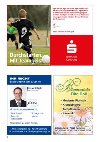 8Rita Doll%u2022 Moderne Floristik%u2022 Kranzbinderei%u2022 Topfpfl anzen%u2022 KeramikOrtsstra%u00dfe 8 a %u00b7 76228 KarlsruheTel. 0721/47 28 08 %u00b7 Fax 0721/47 20 08Sport ist ein wichtiges Bindeglied der Gesellschaft. Er st%u00e4rkt den Zusammenhalt und schafft Vorbilder. Deshalb unterst%u00fctzen wir den Breitensport und die Leistungsvielfalt in den Vereinen. National und international sorgen wir so mit unserem Engagement f%u00fcr die notwendigen Rahmenbedingungen. Damit sind wir der gr%u00f6%u00dfte nichtstaatliche Sportf%u00f6rderer in Deutschland. SparkassenFinanzgruppe. Gut f%u00fcr die Region. Wenn%u2019s um Geld geht %u2013 Sparkasse.Wir f%u00f6rdern den Sport %u2013zum Nutzen der Region!Sparkasse Karlsruhe EttlingenMoritz Schuhmacher | 0721 146-1823 | werbung@spk-ka.deSport_A5 quer.indd 1 16.01.14 13:15T%u00c4TIGKEITSSCHWERPUNKTE: %u00b7 Verkehrsrecht %u00b7 Vertragsrecht%u00b7 Erbrecht %u00b7 Inkasso%u00b7 ArbeitsrechtAm Storrenacker 1a %u00b7 76139 KarlsruheTel. 0721-9639 406 %u00b7 kuegler@rwm-wpg.deEgal wie alt, egal wie stark, egal woher, egal ob mit oder ohne Behinderung %u2013 Sport muss erlebbar und f%u00fcr alle Menschen zug%u00e4nglich bleiben. Der Sport schafft es, dass Menschen etwas gemeinsam erleben. Dieses Miteinander f%u00f6rdern wir.Weil%u2019s um mehr als Geld geht.Durchstarten.Mit Teamgeist.